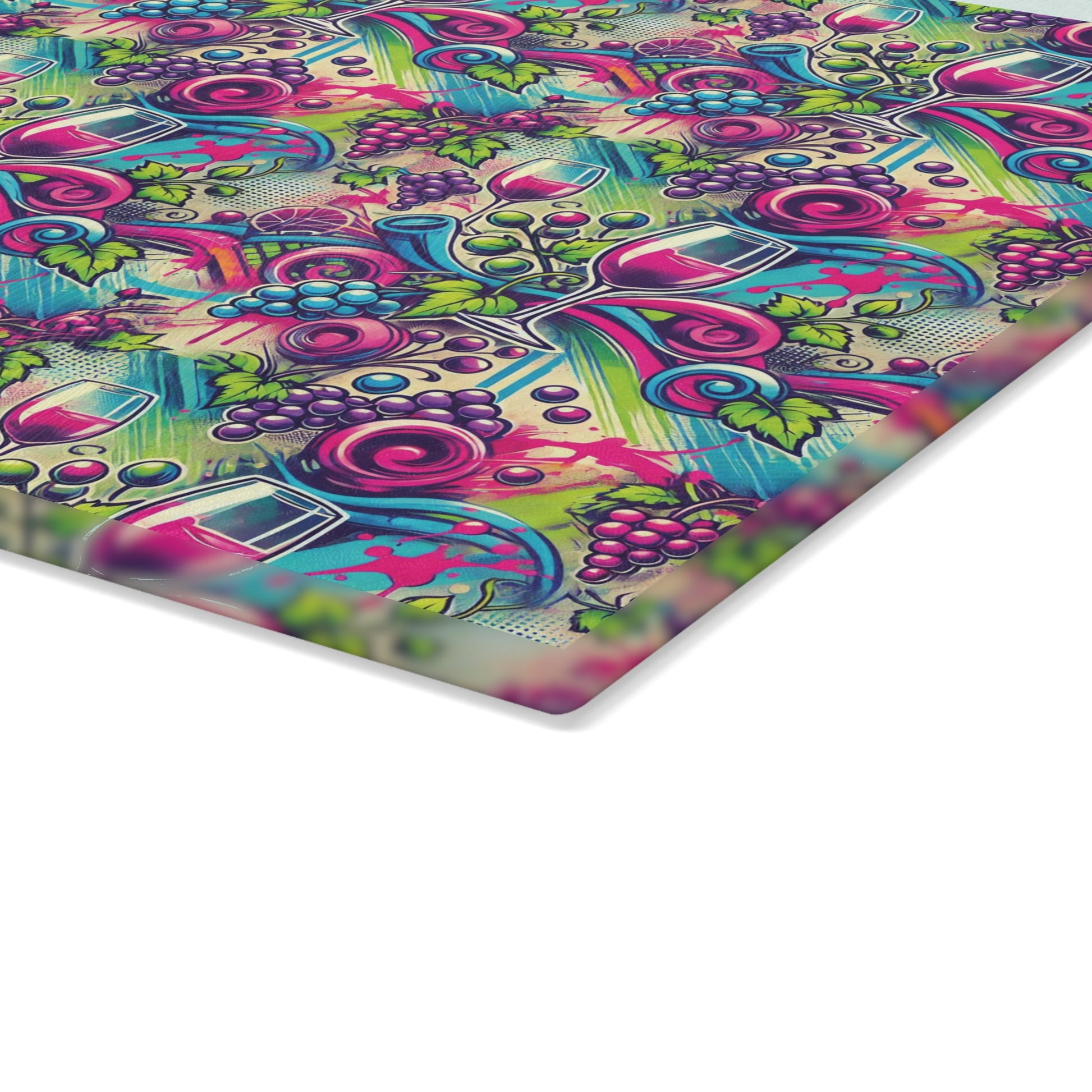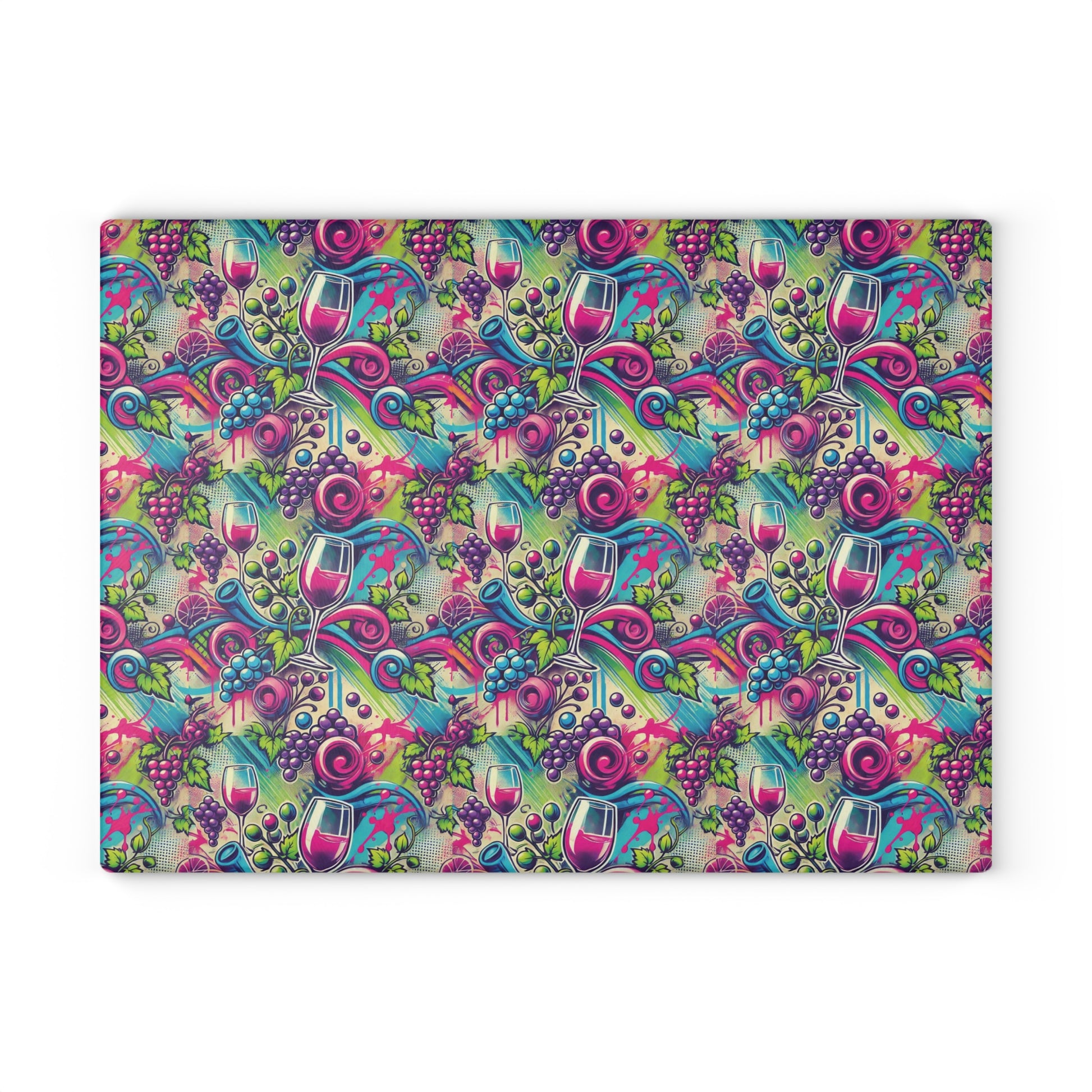 This unique board combines versatility with vibrant style, serving as both a cutting board and charcuterie board, inspired by dynamic patterns like graffiti mud cloth and wine-themed designs. Each board brings a modern twist to your kitchen essentials, blending cultural inspiration with a refined, urban aesthetic. Made from durable tempered glass, it’s not only a functional piece for chopping, slicing, and serving but also a striking addition to your kitchen. Equipped with four rubber dots on the base, it stays secure and stable, ready for both everyday use and special gatherings.